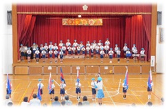 今年度の学習発表会は,はらっ鼓笛隊の元気な演奏からスタート。フラッグを振る1・2年生も頑張りました。