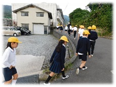 地震時対応避難訓練を行いました。市の防災担当の方からアドバイスをいただき,避難の方法を変更しました。自主防災会長の林田さんからもお話していただきました。防災への意識を高め,いざというときに安全な行動をとることを教えていただきました。