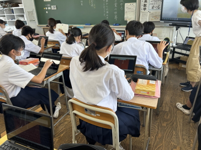 学習したことを振り返るのに、生徒たちの活動場面を多く取り入れ、クラスの仲間と一緒に、みんなで楽しみながら学んでいます。50分の授業があっという間に過ぎました。(ちなみに今日は校長先生もいっしょに授業に参加しました。)