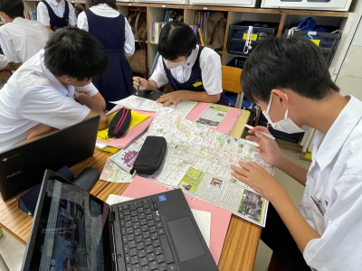 一つのタブレットで京都での自主研修の計画表をみながら、もう一つのタブレットで所要時間を調べている班や、目的地までのルートを決めるのに、どちらの道を通るのがよいか、タブレットでストリートビューを見ながら検討している班がありました。班ごとにそれぞれ工夫しながら、自分たちが立てた計画の確認をしています。