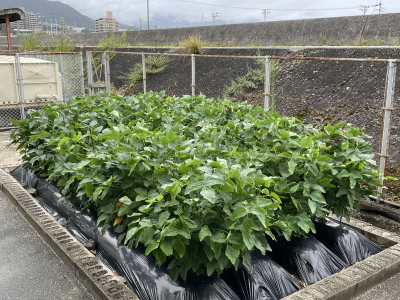 夏休みの登校日は昨日までで、今日は生徒の姿もなく、寂しい廿日市中学校ですが、東校舎の生徒玄関前の畑では、恵木ルームの生徒たちが7月初めに種まきをした「ふくゆたか」という大豆が大きく育ち、葉が風に揺られて存在感を示しています。