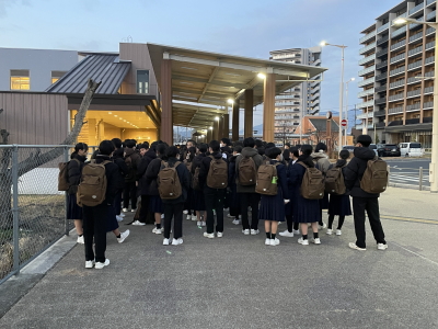 今日から2年生の修学旅行です。集合時刻の7時前には、廿日市駅北口に全員揃いました。