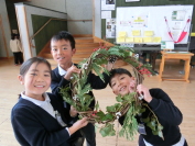 学校の敷地内の法面にあった「くず」で、技術員さんにリングを作ってもらいました。それに、学校の敷地内で育った様々な植物を付けて、オリジナルのクリスマスリースづくりを行いました。放送で呼びかけて、やってみたいと思った子供たちが多目的ホールにたくさん集まってくれました。材料はすべて平良小学校産!とっても立派で素敵なクリスマスリースが出来上がりました☆