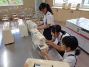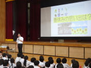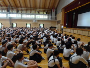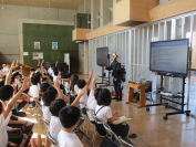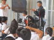 水産技術研究所の方をゲストティーチャーにお招きして、多目的ホールで、これからの水産業についての学習を行いました。実際に水に潜る時のボンベを背負わせもらうなど、体験したり普段見れないものを見たりしながら、自分事として学習を行うことができました。