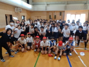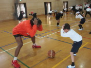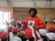 広島ドラゴンフライズのエバンス選手が、平良小学校に来校!!4年生がバスケットボールを教えていただきました。
