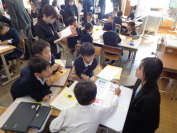 5年生の社会科の授業の様子です。5年生の社会科では、農業・水産業・工業など、日本の産業について学習しています。教科書には様々な写真やグラフ、表などが載っています。子供たちは、これらの情報から何が分かるか?について自分で考えたり、友達と話し合ったりしています。現代は情報過多の社会…情報に踊らされるのではなく、何が正しくて、自分はどう行動することが大切なのか…「情報を活用する力」が大切だと思います。