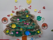 左のツリーは、松ぼっくりで樹の部分ができています。右のツリーは、包装紙で出来ていて、結構大きいです。