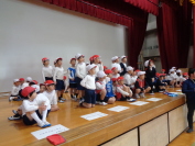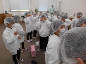 オタフクでは、実際に工場の中で働く人たちが衛生管理にすごく気を付けて行っていくことを学びました。髪の毛が落ちないように白い被り物をし、靴の裏も消毒します。工場の見学では、原料の入っているタンクの大きさにびっくり!お土産に、作りたての、持ったらあたたかいオタフクソースを一人1本ずついただきました☆