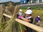 総合的な学習の時間で、稲刈り体験を行いました。1学期に田植え体験をさせていただいた田んぼの稲穂が、地域の皆さんのおかげで立派に実っていました。今日は鎌(かま)を使って手で刈り取り、6束をひもでぎゅっと結んで、「はで干し」をしました。子供たちにとってはきつく結ぶことが非常に難しいことだったようで、なかなか苦戦していました。