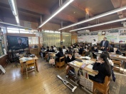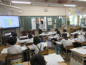 廿日市市役所環境政策課の方々による、地球温暖化防止教室の様子です。家庭で出るごみの分別について、班ごとに意見を出しみんなで考えました。「えっ!これは○○ゴミ?」と、自分の予想と違っているものも多くあったみたいで、これからの生活に役立つ内容でした。「一人一人ができること…」を少しでも多く行っていくことの大切さを学びました。