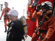 消防署では、消防士さんが実際に火事の現場で着る服など、本物をたくさん見せていただきました。空気ボンベを背負わせてもらった子供たちは、「ランドセルよりは重いけれど、タブレットを入れたランドセルよりは軽いかなぁ。」と、自分たちの身近な生活の場面と比べていました。