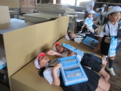 社会の「工場の仕事」の学習で、石原工芸に見学に行きました。目的は、働いている人の様子を見学して、工夫を見つけることです。ダンボールでできた大きな鳥居やけん玉に子供たちは興味津々!ダンボールでできたベッドには、実際に寝てみました。