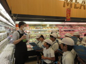 同じ日に3年生は社会科の学習で、お店ではたらく人の工夫を見つけることを目的に、スーパーマーケットの見学に行きました。普段は入れないバックヤードの見学をさせてもらったり、店長さんに説明をしてもらったりしました。その後は、あらかじめグループごとに決めていたスーパーマーケットの工夫(新鮮さ、安さ、サービスなどなど)を見つけました。