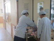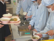 当番で協力しながら、給食準備をしています。