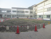 中庭に、チューリップの球根を植えています。どんな色の花が咲くでしょうか。楽しみですね。球根を植えるために、大野中学校の生徒さんが耕してくれました。ありがとうございました。
