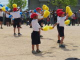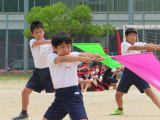 高学年の徒競走は,やはり力強い走りが見られました。腕をしっかり振り,思いっきりゴールを駆け抜ける子どもたちは,みんなとても笑顔でした。また「ダンシング玉入れ」では,5年生61個,6年生87個と,さすが6年生の圧勝でした。