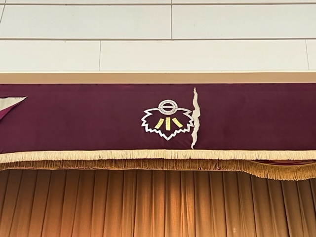 体育館に入られた方ならみなさん気づかれていた、ステージ上の校章が付いている幕「一文字幕」ですが、かなり破損が目立ておりました。改修の方法はないか、いろいろ道を探ってみたのですが、よい方法が見つからず、そこで今回の創立150周年記念事業の一環としてリニューアルをする計画を立てていました。